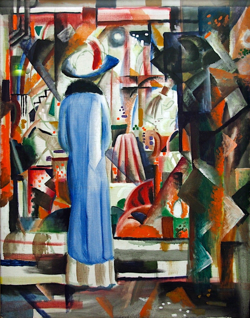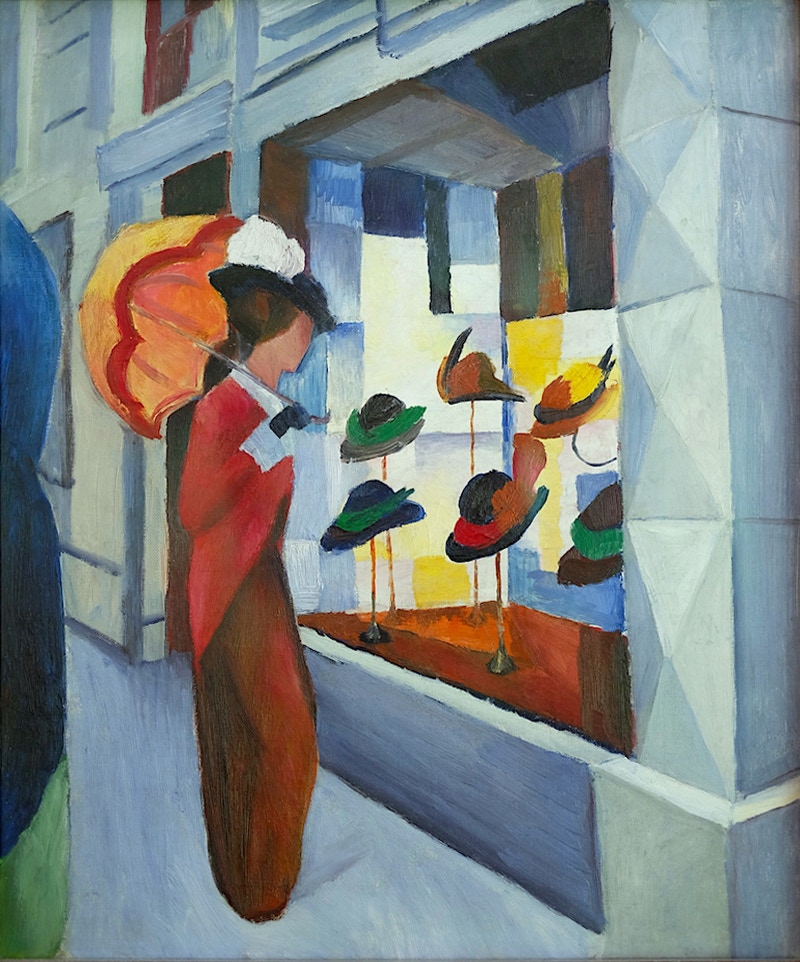 Woman with Umbrella in Front of a Hat Shop (1914)